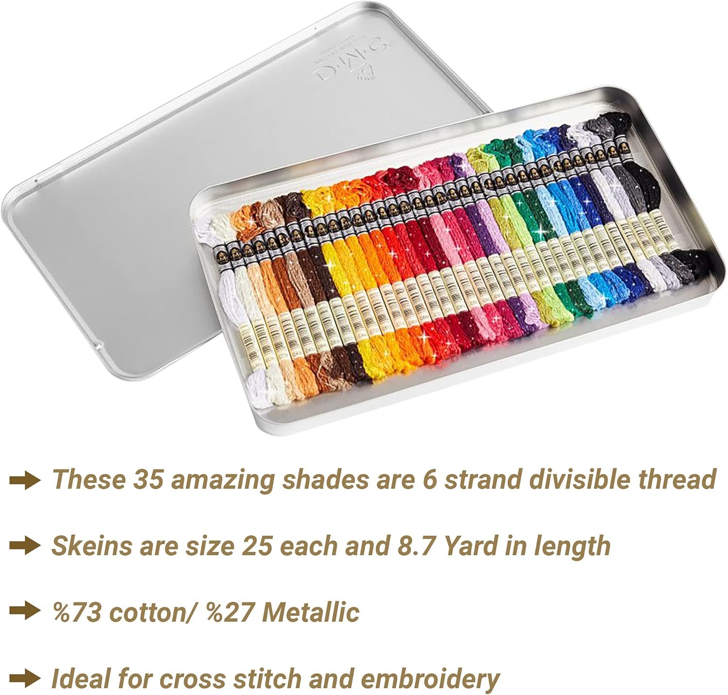 DO YOU WANT THE HIGHEST QUALITY OF EMBROIDERY FLOSS SUPPLIES AND ACCESSORIES IN THE MARKET? THEN YOU ARE IN THE RIGHT PLACE .. ▪️ This exclusive tin includes 35 colors of Mouliné Étoile. The ultimate gift for any crafter, the beautiful tin contains the entire range of our sparkly stranded cotton thread. Stamped with the DMC logo, this special tin also comes with two cross stitch and embroidery patterns. There is also a pack of 16 needles size 3-9 for your convenience. ▪️ The premium thread is made up of six size25 easily separated strands, which allows you to customize the thickness of the thread by choosing the number of strands. Each Skein is 8.7 Yd. DMC Embroidery Floss is 100 % colorfast and fade resistant. The Tin includes : ▪️ 35 vibrant and sparkly color from Mouline Etoile Collection ▪️ Threads are 73% Cotton / 27% Metallic ▪️ DMC hand needles size 3-9 / 16 per package ▪️ Needles are made by premium grade nickel plated steel. The package is tarnish resistant. ▪️ Made in Italy By DMC. Please refer to the provided picture for the list of colors and descriptions available in this box. ✔️ U.S.A BASE, 24/7 CUSTOMER SUPPORT GUARANTEED: All design and tasting made in France. Packages are distributed by US companies to make an Amazing Value for money.. Charming Melodie offers 24/7 customer email service. Please contact us with any questions. %100 Satisfaction Guaranteed, If not Satisfied for any reason simply return the product to us for a replacement or a full refund. (no damaged or used product). BUY IT TODAY AND LOVE IT FOREVER!