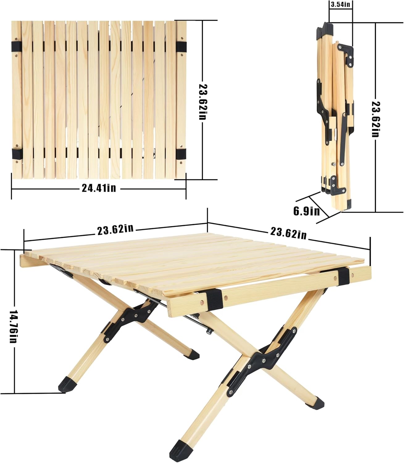 beach table Introduction: Bring effortless style and convenience to your outdoor gatherings with this portable picnic table. Crafted from natural beech wood, the low picnic table features a roll-up desktop and an innovative X-frame that sets up in seconds—no tools required. At just 8.49 lbs and 14.76" tall, it's the ideal beach table for sitting on the sand, a charming boho picnic table for garden parties, or a compact camping companion. Complete with a carry bag, it's designed for life on the go. low picnic table Features: Tool-free 4-step snap assembly; elastic-band connected panels for quick setup. Natural beech wood construction with warm, boho-inspired aesthetic. X-shaped frame and triangular supports for wobble-free stability on uneven ground. Roll-up desktop and folding frame pack into included heavy-duty carry bag. Ultra-lightweight at 8.49 lbs; supports up to 66 lbs of gear and refreshments. Versatile use: beach, picnic, camping, BBQ, tailgate, or indoor floor seating. portable picnic table Specifications: Product Name: Portable Foldable Outdoor Picnic Table - Natural Beech Wood Camping Table with X-Frame Design - Small Size Main Color: Natural Wood Main Material: Beech Wood Assembled Length: 23.62 in Assembled Width: 23.62 in Assembled Height: 14.76 in Product Weight: 8.49 lbs Max Load Capacity: 66 lbs Storage Bag: Included